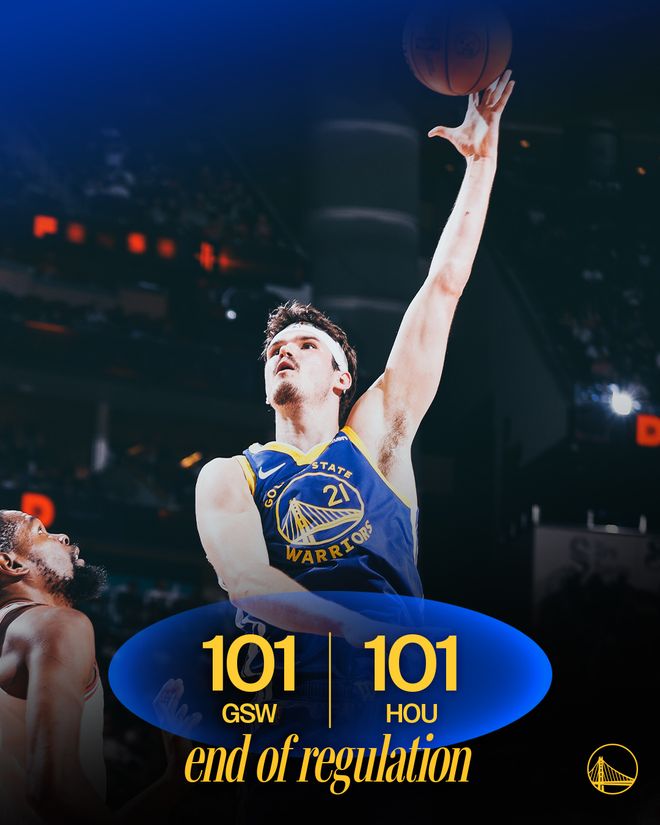 史密斯篮下制造犯规两罚一中,霍福德三分不中,申京篮下打3分成功,第四节还有1分40秒时火箭队以97-95领先。梅尔顿左侧45度角出手三分命中,勇士队98-97反超。申京保持篮下威胁,勾手打进,99-98。霍福德手不软,底角投中三分,勇士队以101-99领先。申京延续进攻状态,转身勾手命中,第四节还有27.6秒时双方战成101平。勇士队暂停后梅尔顿急停跳投,杜兰特被吹犯规,火箭队提出挑战。裁判回看录像后改判,杜兰特盖帽成功,双方中圈争球,比赛还剩下6.5秒。霍福德把球拨给梅尔顿,科尔在还有2.3秒时请求暂停。勇士队发边线球失误,最后0.3秒汤普森空接上篮不中,比赛进入加时赛。